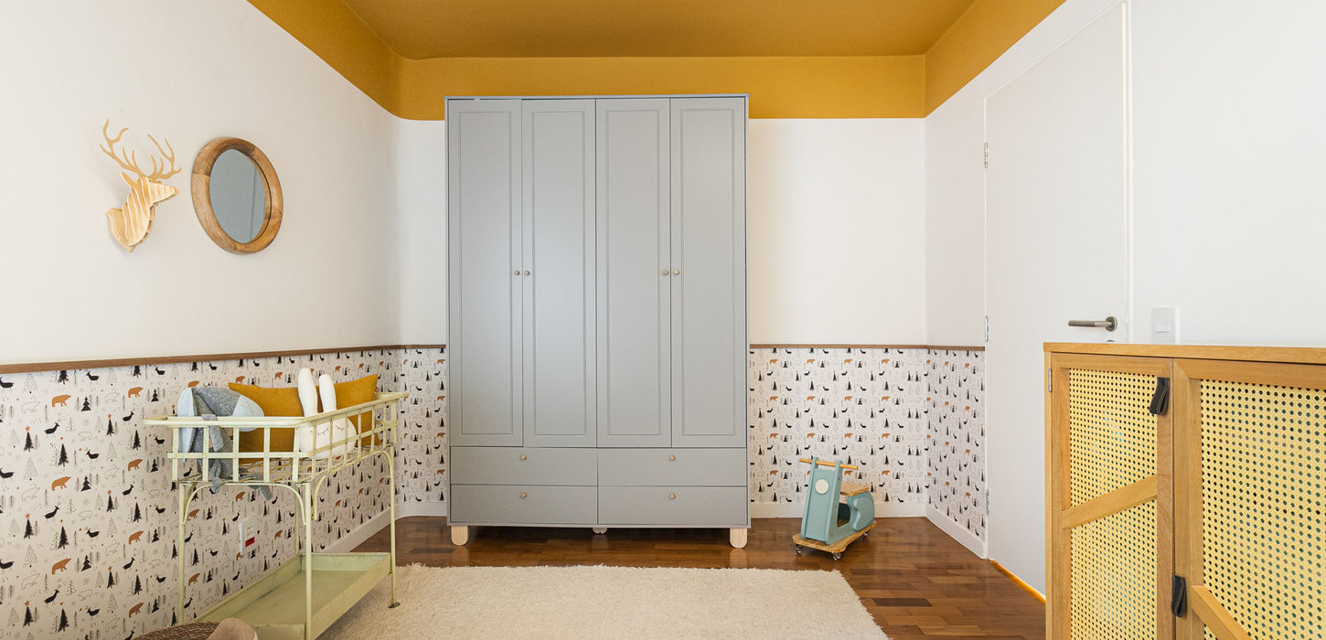 Já o quarto do bebê foi pensado como um ambiente alegre, afetivo e funcional. O forro pintado de amarelo traz leveza e um toque lúdico, enquanto o berço e os armários em madeira mantêm o tom aconchegante. O destaque é o papel de parede exclusivo, criado especialmente para o projeto, que torna o espaço único e cheio de personalidade.